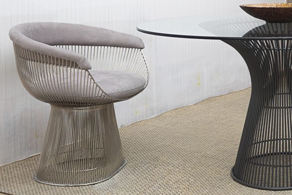 A cadeira Platener traz um design com inúmeras varas de aço inox, uma cadeira pode ter até 1.400 pontos de soldas.